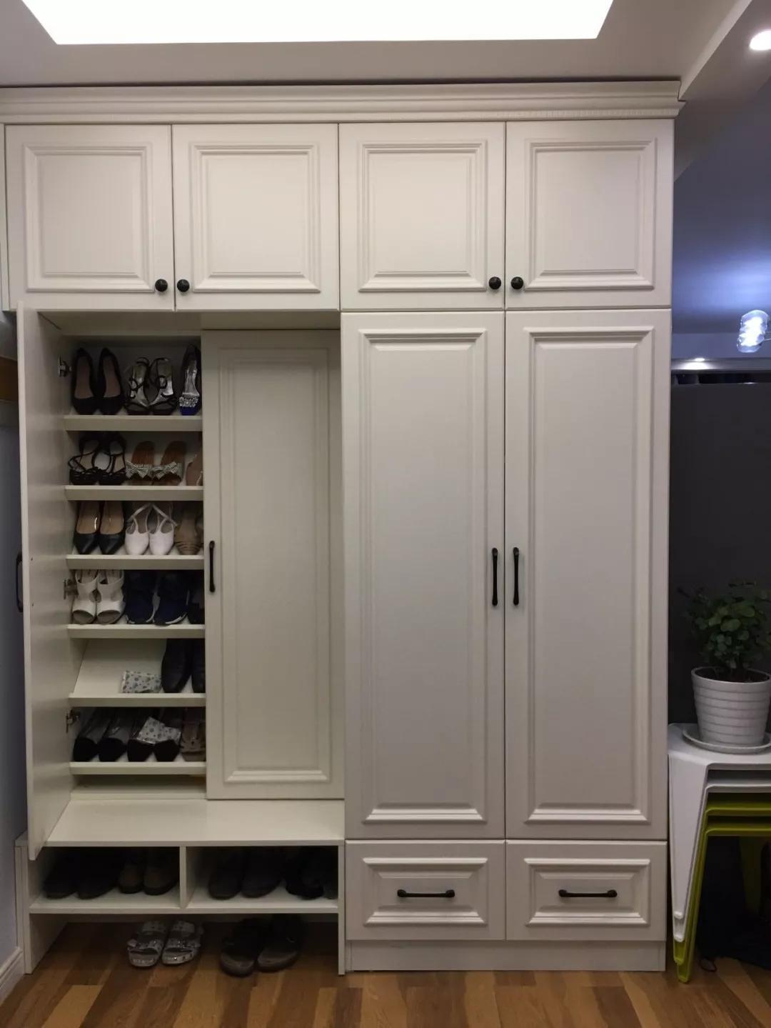 把鞋子摆放在底部留空的地方,进门的时候看到整排整齐的鞋子,也会觉得更舒服一些,省的一地的鞋子看了太乱。