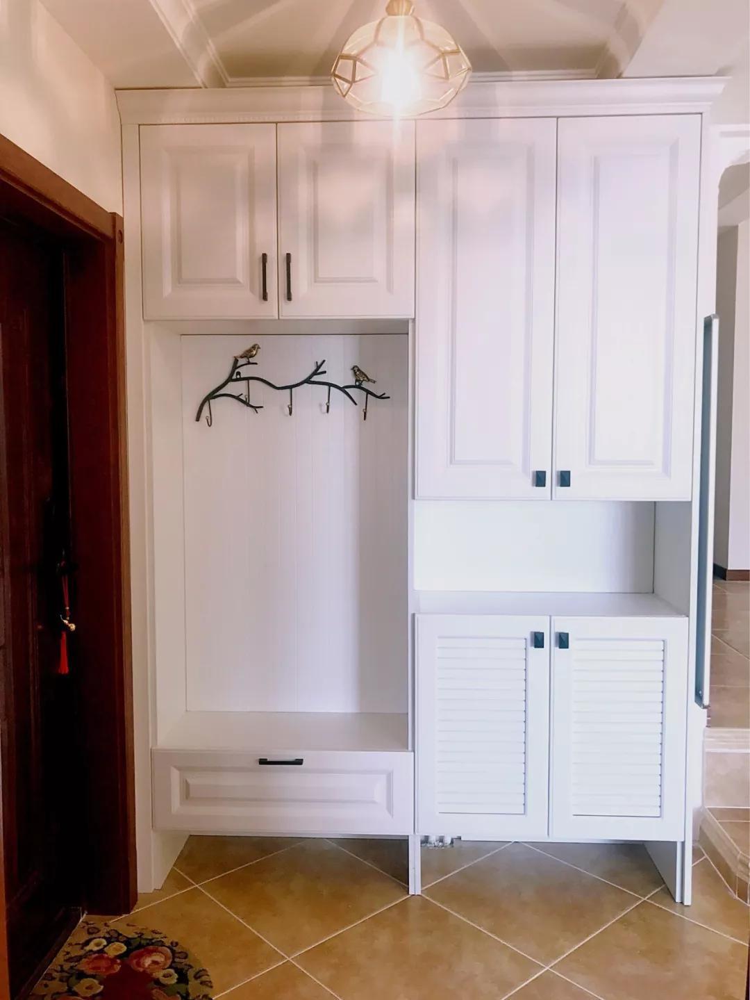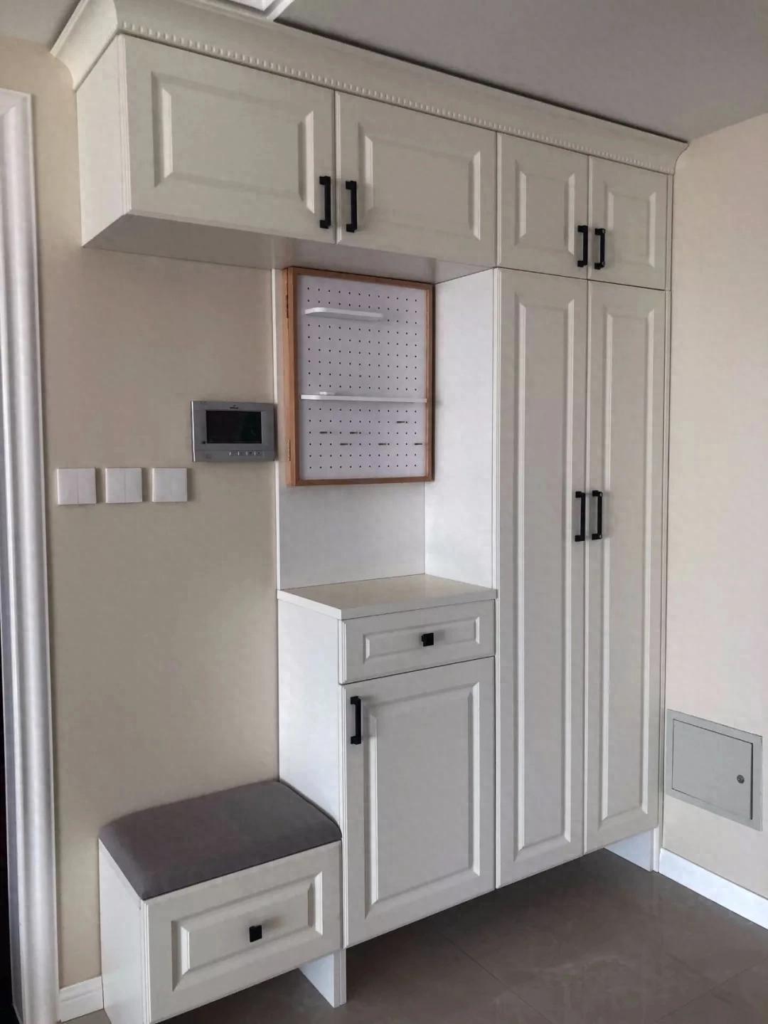 鞋柜边上还可以做个换鞋凳,这样方便我们坐着换鞋,而且换鞋凳的底部也是可以利用起来做收纳的,上方就可以挂衣服之类的大件物品。
